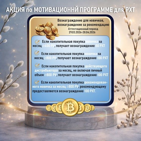 Если накопительная покупка новичка за месяц ≥400 PV, предоставляется вознаграждение 50 PXT
